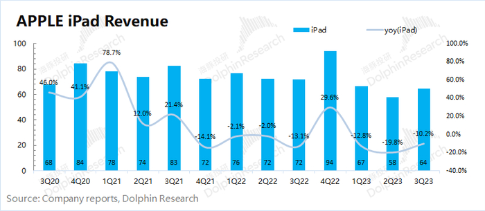 2023财年第四季度 iPad 业务收入64亿美元,同比下滑10.2%,略好于彭博一致预期(61.4亿美元)。iPad业务的当前下游整体需求仍然偏弱,导致该业务收入持续低迷。