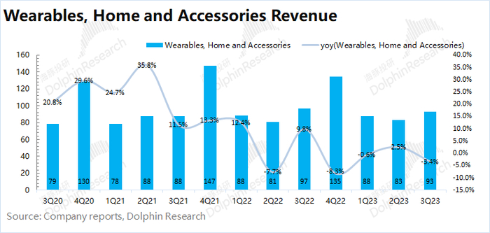 2023 财年第四季度可穿戴等其他硬件业务收入93亿美元,同比下滑3.4%,略低于彭博一致预期(94.3亿美元)。苹果的可穿戴等其他硬件业务本季度仍有下滑,其中一部分受秋季发布会较晚于去年同期的影响,而整体市场需求仍相对低迷。