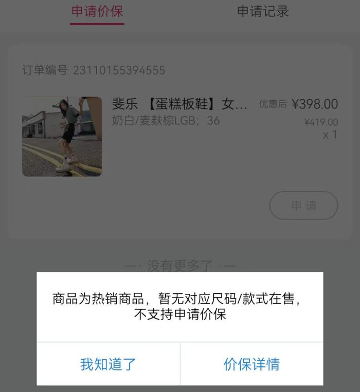 记者的实测也验证了这一现象——当记者在唯品会对某承诺“10天保价”的商品进行保价申请时,弹出的提示是“商品已不在售,无法保价”。
