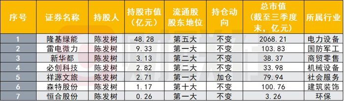 百亿级牛散陈发树动向也备受关注,根据三季报数据梳理发现,陈发树在今年三季度末持股7家公司,合计持股市值为67.7亿元。其中隆基绿能、雷电微力、新华都、必创科技、森特股份、恒合股份6家公司持股保持不变,加仓1家公司,为祥源文旅。持仓股的行业分布比较分散,持仓股多数为中小市值个股。