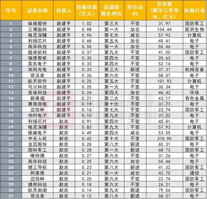 加减仓方面,赵建平三季度加仓三博脑科、利扬芯片、高华科技、美埃科技,减持格灵深瞳,新进埃科光电,其余持股保持不变。赵吉三季度加仓高华科技,减持维峰电子、阿莱德,新进龙迅股份、国科军工、理工导航、航天南湖、菲沃泰。