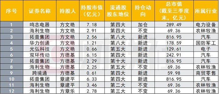 另一位百亿级牛散“章盟主”及其家族成员也长线持有多只个股。数据显示,“章盟主”家族共现身7家公司的股东名单之中,持股总市值为38.39亿元。其中,新进了5家上市公司公司,分别为拓普集团、华力创通、光弘科技、双环传动、跨境通,配置方向多是汽车行业,方文艳加仓鸣志电器,该家族对海利生物的持仓均保持不变。