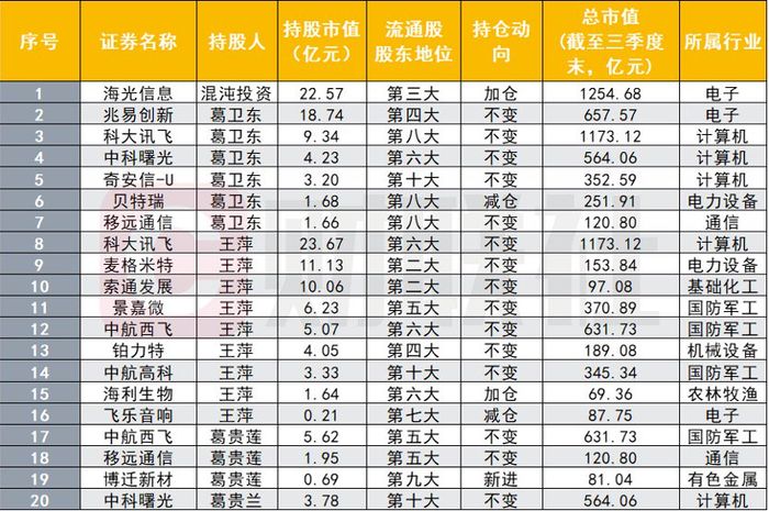 Choice数据显示,截至三季度末,葛卫东及其家族合计持股16家公司,持股市值总额达到138.85亿元。其中,持股不变的公司有11家,加仓2家,为海光信息和海利生物,新进公司仅1家,为博迁新材。此外,4家公司出现了家族成员共同持股的现象,6只个股持股市值均在10亿元以上。葛卫东本人共现身6家公司的十大流通股东之列,三季度末持股总市值为38.85亿元。