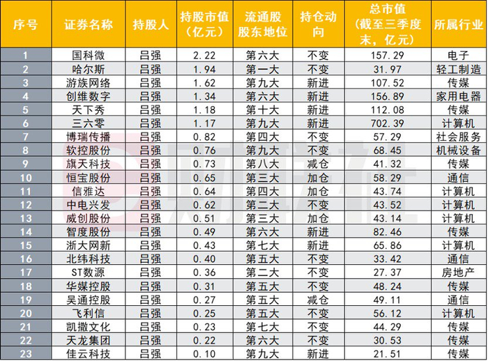 “最忙牛散”吕强也在行业布局上有所偏重,三季度共持股23家上市公司,持股市值达到17.26亿元,其中就有17家来自TMT行业(传媒8家,计算机6家,通信3家),如属AI概念股的三六零、游族网络、信雅达等。