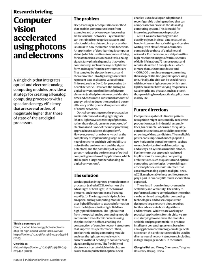 Nature特邀发表的该研究专题评述中指出“ACCEL有望使这些新的计算架构,比预想中早得多地应用于现实生活(ACCEL might enable these architectures to play a part in our daily life much sooner than expected.)”。