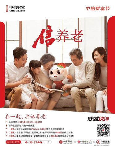 “中信财富节”将从2023年11月1日持续至2024年3月31日,以“在一起,十分美好”为主题,“信”养老、“信”财富、“薪”投资、“欣”传承四个关键词贯穿全场。