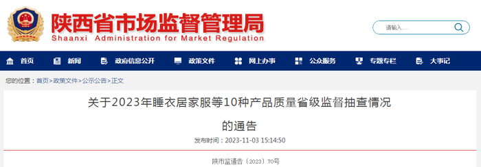 陕西省市场监管局通报2023年睡衣居家服等10种产品质量省级监督抽查情况