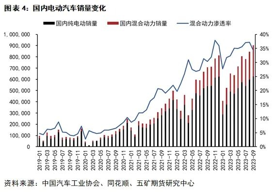 国内电动汽车销量方面,国内混合动力电动车(含插混、增程等)月度销量渗透率占比在2020年12月首次超过10%,之后呈上升趋势,2023年多月在35%以上。年度对比来看,2020年全国混合动力电动车销量25.8万辆,占全年132.9万辆新能源汽车销量的19.4%。2023年1-9月,全国混合动力电动车销售总量为178.9万辆,同期新能源汽车销量为627.5万辆,渗透率超过28.5%。