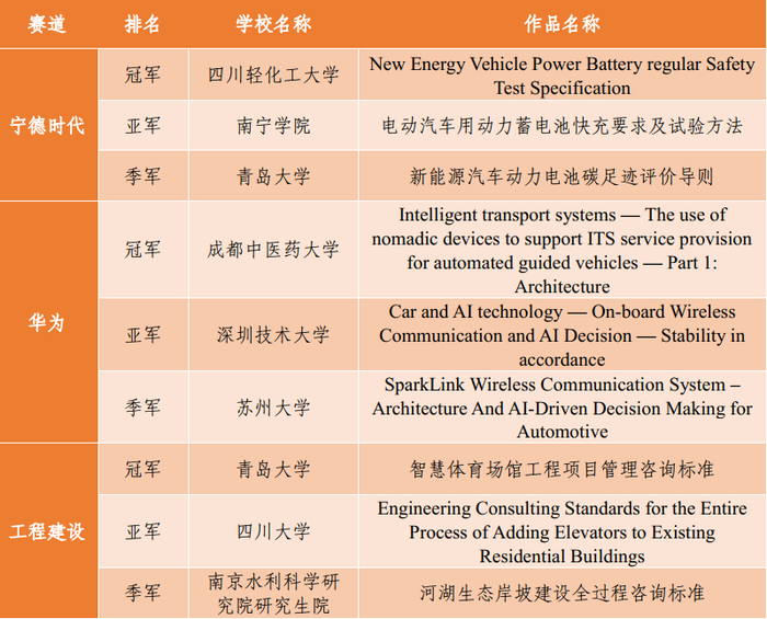 本次大赛按照“业界出题、学界答题”的竞赛模式,由华为技术有限公司、宁德时代新能源科技股份有限公司、中国工程建设标准化协会分别出题,围绕新能源汽车动力电池、车载无线通信系统与人工智能决策、建设项目全过程工程咨询等主题设立了3个专业赛道,邀请高校学生组队参赛。比赛内容为依照国家或国际标准提案模板,编制项目建议书与标准草案。