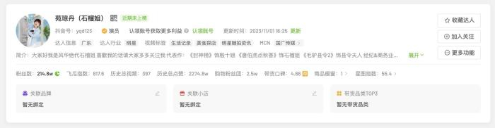 苑琼丹抖音主页截图而在某MCN机构工作的安琪则说得更直接,“既然苑琼丹已经宣布日后要专注直播带货,那她大概率会签一个MCN机构,这个公司专门负责把她的直播项目做起来,签的合约应该也以GMV (商品交易总额)的提成为主。”“但是据我所知,苑琼丹的带货成绩其实不太好。之前业内有消息说她短期合作过一个头部MCN机构,但因为她不太带货,所以没有续约。”安琪透露:“因为按照合约,咖位大的演员能拿无责佣金,收入也是明星赚大头,这种情况下如果卖不出去东西,与其签约的MCN机构很可能亏损,会选择不续约。”据飞瓜数据显示,在90天内,苑琼丹带货商品数量繁多,种类繁杂,涉及个护家清、食品饮料、家居用品等领域。四场带货直播销售额共计10万-25万,客单价仅为76.5,成绩确实不算亮眼。值得注意的是,苑琼丹签约的MCN公司“国广传媒”旗下达人寥寥,并未孵化过头部达人,“造星”能力还有待商榷。因此选择息影之后,如果直播带货无法达到预期,苑琼丹极有可能面临进退两端的尴尬局面——毕竟转型主播容易,重回演员行业,市场就不一定买账了。