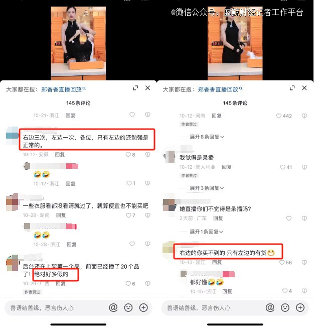 在郑香香相关视频的评论区,有网友总结出了郑香香过品的规律:一般是右边递三次,左边递一次。右边递的“爱马仕”盒装的大多看起来品质很好的衣服;左边则是不带盒的低价日用品,通常是备货量更大容易买到的。此外还有网友指出,不是所有展示过的商品都能买到,好些品根本没有链接。按照反馈来看,那些抢不到的、没上架的产品,更像是引流之用。
