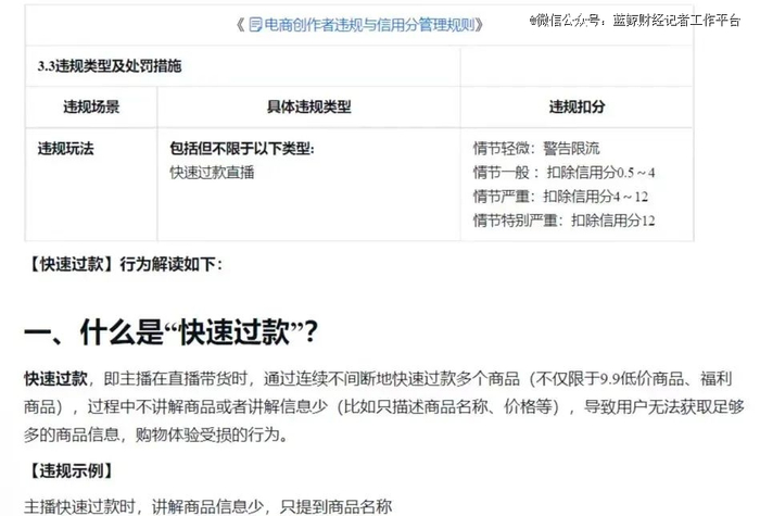 “快速过款”顾名思义就是主播在直播带货的过程中通过连续不间断的快速过款多个产品,讲解过程中不讲解产品信息或者只提产品的名字和价格等非常少量的信息。