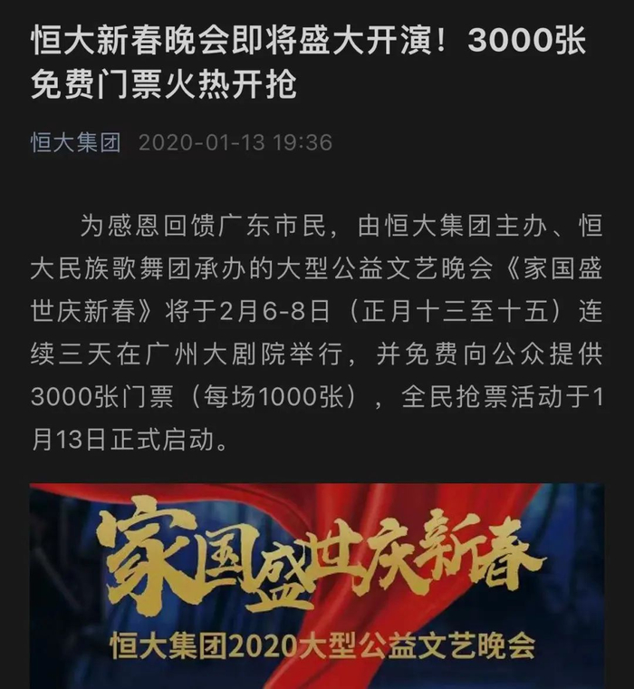 在恒大集团官方公众号中搜索恒大歌舞团发现,最近的一篇相关的动态是2020年1月13日发布的。其中提到,恒大新春晚会即将盛大开演,该晚会是由恒大集团主办、恒大民族歌舞团承办的大型公益文艺晚会。
