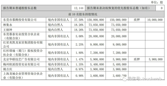 截至2023年9月30日,慕腾投资持股为37.5%,王炳坤、林集永分别持股为18.26%,慕泰投资持股为5%,红星美凯龙持股为2.25%,红杉璟瑜持股为1.8%,汪林朋旗下华联综艺持股1.47%,欧派投资持股为1.35%;姚吉庆持股0.97%;