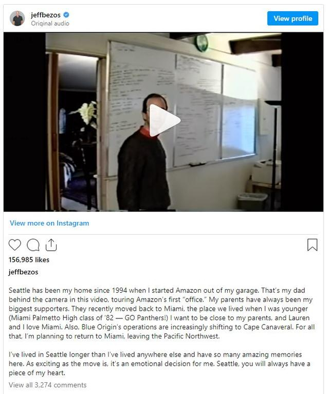 贝佐斯在告别西雅图贴文里分享了由继父录制、他来介绍亚马逊第一间车库办公室的简短视频,并称“我在西雅图生活的时间比在其他任何地方都长,这里有很多美好的回忆。尽管此举(搬家)令人兴奋,但对我来说是一个感怀的决定,西雅图将永远留在我的心中。”