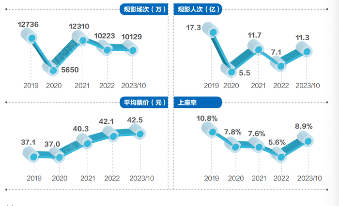 消费端的表现也传递到了上游,《2023强影之路》数据显示,从影院数量上看,2023年截至10月,新开影院数量660家,预计全年和2022年相差不大,但闭店数量预计为500-600家,相比2022年的833家有一定回落。