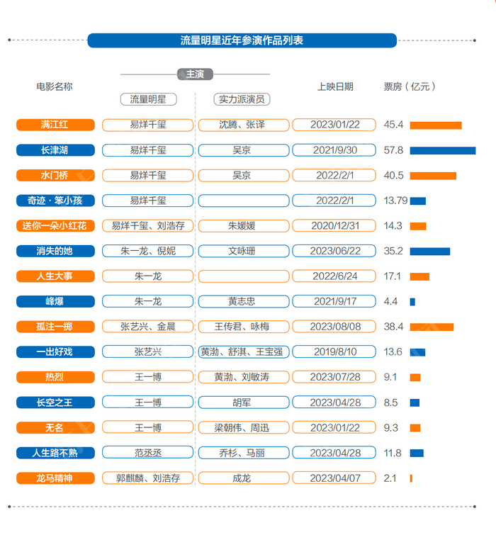 此外,曾经不被市场认可的流量明星逐渐在电影中发挥力量,流量明星+实力派演员搭配的模式进一步发展,2023年除了易烊千玺外,朱一龙、张艺兴、王一博等流量明星,演技、市场号召力也有一定的提高。