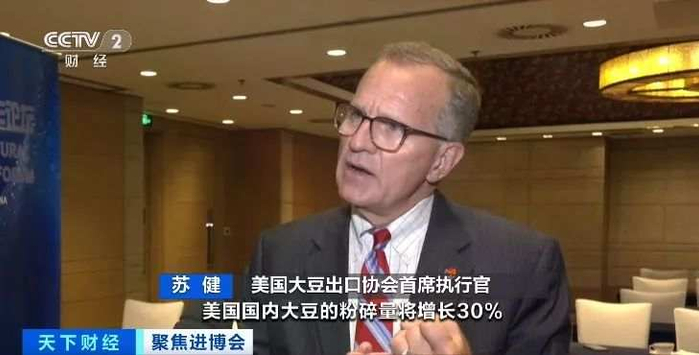 美国大豆出口协会首席执行官 苏健:可以确认的是,对于美国大豆行业而言,这是我们参加进博会规模最大的代表团。我们预计未来7年至10年,美国国内大豆的粉碎量将增长30%。但同时,我们也预计美国大豆的产量会同步提升。抵消后,届时美国大豆出口量仍能保持在现有水平。