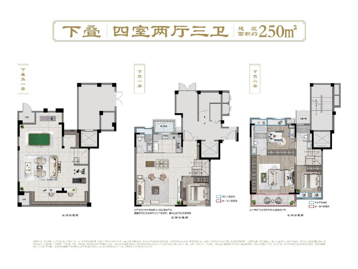 户型设计上得益于项目约1.3的低容积率,整个项目只规划了洋房+叠墅两种产品,纯低密社区,室内外空间更阔绰,圈层纯粹。目前,项目主推建面约250㎡下叠、约145㎡上叠、约150㎡中叠,其中,建面约250㎡下叠样板间已经对外公开。