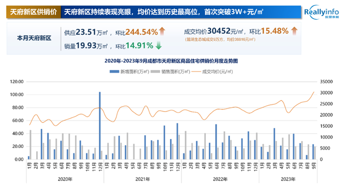 尤其是成都9.26新政后购买144㎡以上户型不再审核购房资格,天府新区的客户数量激增,来自全城乃至全国的改善客户把目光瞄准这里。据锐理数据统计显示,受新政影响的天府新区量稳价涨,其9月均价达到历史最高位,首次突破3W+元/㎡,高端住宅市场愈发繁荣。