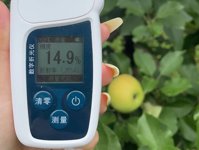 普通苹果的糖度到达11~12度就已经很甜了,看我们直接在树上随机挑选一颗青森苹果,糖度就已经达到了14.9!