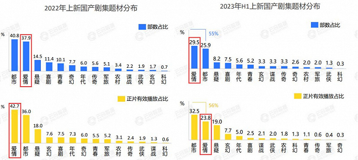 从市场的项目数量上来看,第三方数据统计2022年上新剧中,言情甜宠所属的爱情剧类型占40%左右,而在2023年H1的上新剧中这一数量已经下降到25%左右,但在每年热剧Top20的排行里,爱情剧的占比却一直不低于50%的占比。