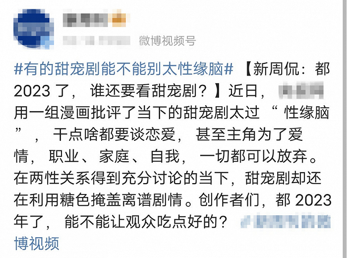 一部都市剧里的项目会上,编剧老白与导演刚刚在严肃职业故事和都市情感故事的不同方向里选择了后者。会后文学策划分享了最新的网络舆情,正在批评“都2023了,谁还要看甜宠剧?”
