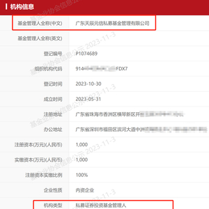 基金业协会网站信息显示,“广东天辰元信私募基金管理有限公司” 成立于今年5月31日,注册资本为1000万元人民币,注册地在广东省珠海市,办公地在广东省深圳市,目前公司有5名全职员工。