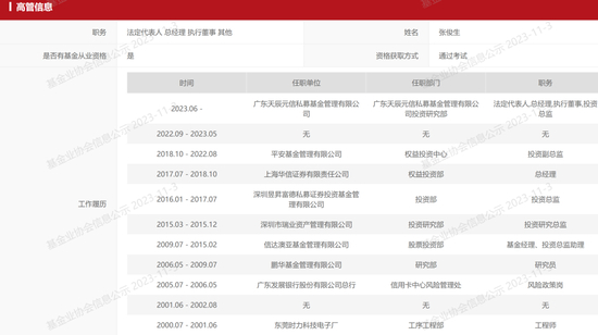 张俊生2022年8月从平安基金离职后,中间有大半年的空档期,随后他选择和朋友一起创业,创立了广东天辰元信私募基金管理有限公司,出任公司法定代表人、总经理、投资总监等职务,开启了新的征程。