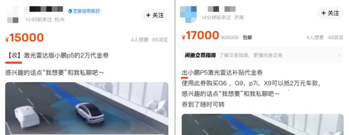 然而这届网友不一般,很快就有人发现闲鱼上已经有人在出售“小鹏P5激光雷达补贴代金券”了。有买就有卖,目前价值2万元的代金券在平台上售价15000元-17000元不等。