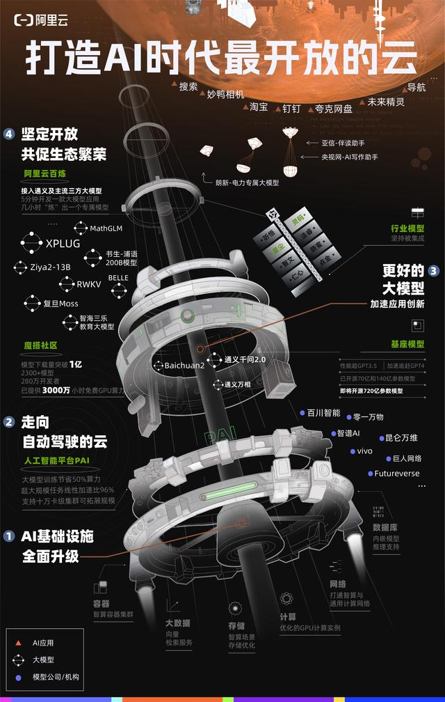 “在各个维度上,今天阿里云所面对的客户分很多阶层。有的可能来自于模型创业公司,对于他们来讲,更希望使用到最先进的AI基础设施做大模型研究。还有一类客户,希望能够把已有的开源模型有效结合自己产品做二次创新。更多则希望用通义千问这种开源的模型,帮助它做自己的业务系统开发。”周靖人说。“今天,阿里云的要服务好所有上面讲到的客户,所有在智能时代期待利用数字创新,或者利用人工智能的方式做科技创新的客户,并希望以完善的产品矩阵有效支持好他们,这就是我们当前的定位。”