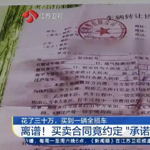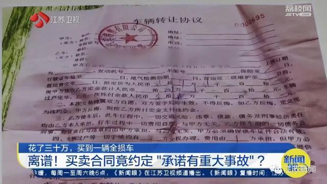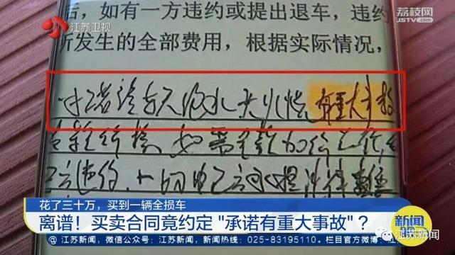 花了三十万却买了个全损车,侯先生找友东车行讨说法。结果车行手上的二手车买卖合同显示,里面明确约定“承诺该车无泡水、无火烧、有重大事故”。