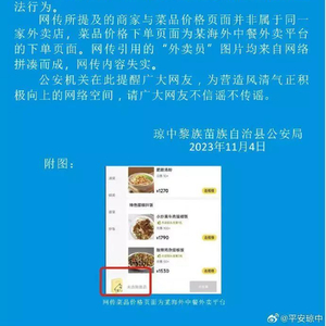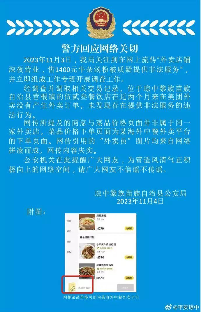 近日,“外卖店铺深夜售1400元牛杂汤粉”引起质疑。11月4日,海南省琼中黎族苗族自治县公安局回应网络关切↓