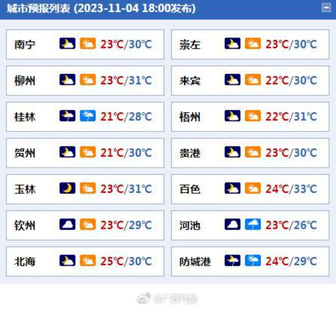 南宁市:4日晚上到5日白天,多云间阴天有零星小雨,偏南风2~3级,最低气温23℃,最高气温30℃。