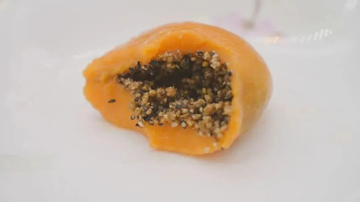 木鳖子籺是黄色的白薯籺,但并不是用黄薯做的,而是使用了木鳖子!制作出来的木鳖子籺,色、香、味、形佳,深受防城港人的喜爱。趁热咬开,浓浓的米香混合芝麻花生香直勾人,口感绵软柔韧,扁圆温暖,可谓是老少皆宜。