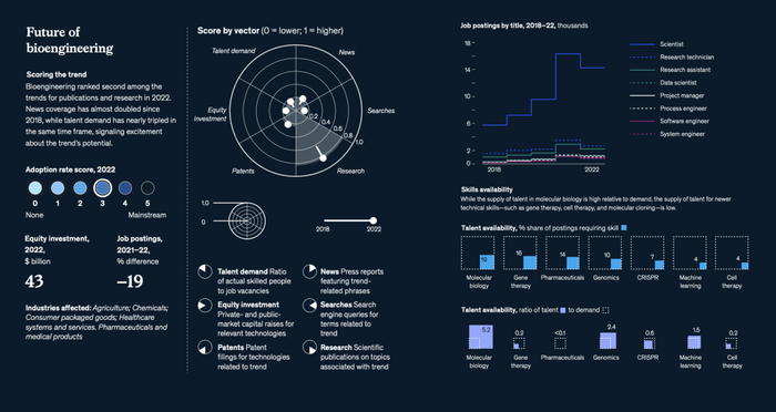 麦肯锡的研究表明,目前400种生物工程的应用案例在科学上都是可行的,预计从2030年到2040年,这些用例将产生2万亿到4万亿美元的经济影响。