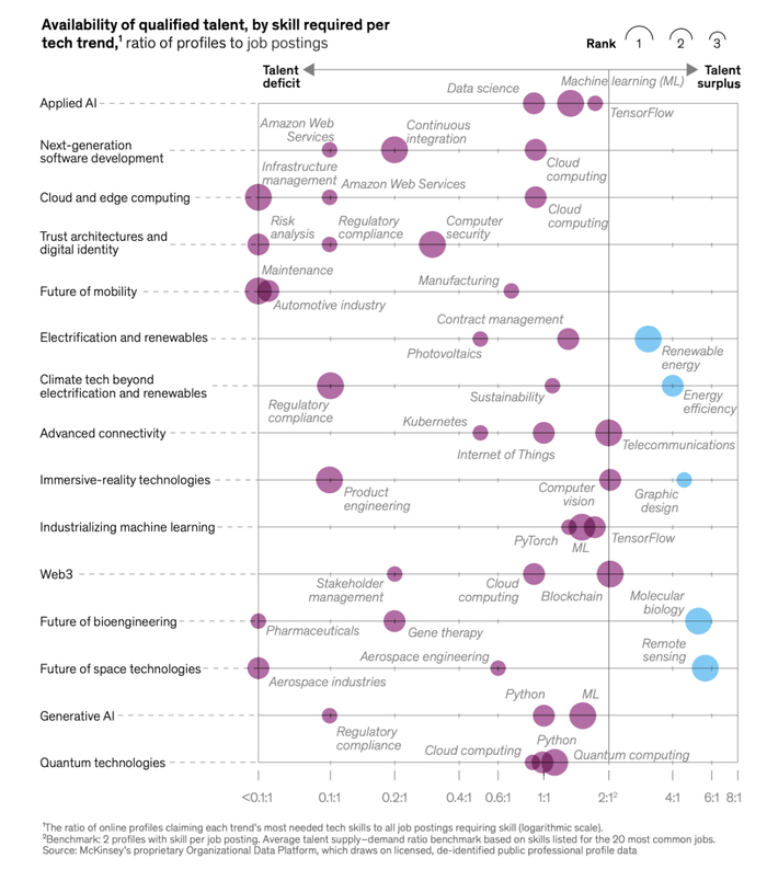 数据显示,与2021年相比,2022年全球职位发布总体上减少了13%,但与文中提到的15个科技趋势相关的领域的职位发布在2022年增长了15%。麦肯锡对这些技术趋势中的350万个职位发布进行了调查,发现许多最需求的技能,每个职位的合格从业者数量还不到全球平均水平的一半↓
