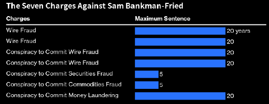 SBF面临的七项指控分别为:针对FTX客户的远程欺诈罪;针对FTX关联交易公司Alameda Research的贷款机构(Alameda lenders)的远程欺诈罪;针对FTX客户的远程欺诈共谋罪;针对Alameda Research的贷款机构的远程欺诈共谋罪;针对FTX投资者的证券欺诈共谋罪;针对FTX客户的商品欺诈、共谋罪;洗钱共谋罪。这意味着,SBF或将面临最高110年刑期。