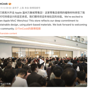 11月5日,苹果公司CEO蒂姆·库克在微博发文称,苹果温州万象城零售店正式开设。