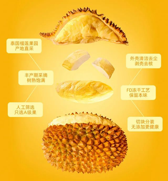 这款冻干榴莲,用的就是“榴芒一刻”泰国合作果园里产的金枕榴莲A级果。