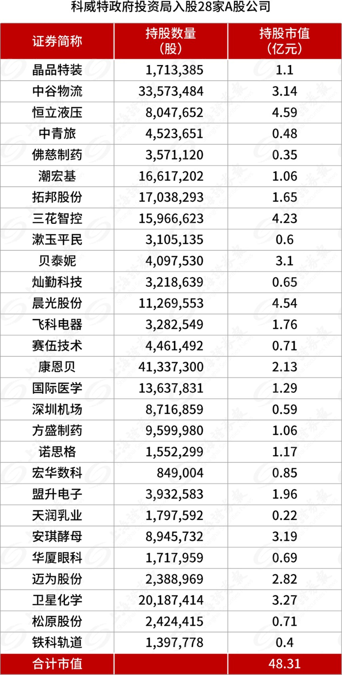 科威特政府投资局是全球第五大代表政府投资的主权财富基金,目前管理资产规模约5.86万亿元,截至11月4日,28家A股公司的前十大股东或无限售条件股东榜中,出现科威特政府投资局。