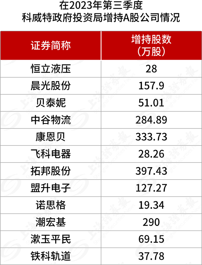 科威特政府投资局增持了12家A股公司。