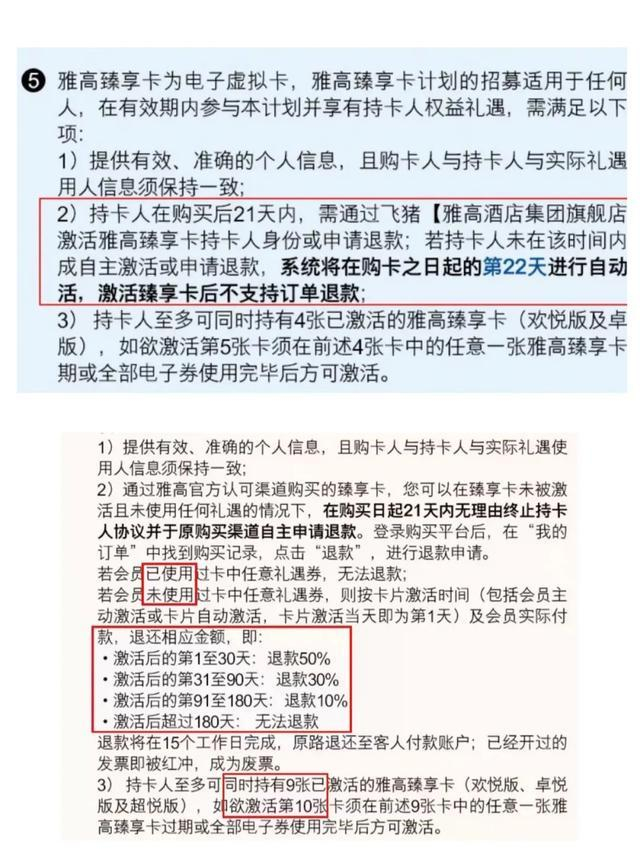 根据雅高集团客服提供的规则说明,如果持卡人21天内未申请退款或主动激活,该卡会自动激活,激活后即使未使用任何权益,也不支持退款。不过,在小雪沟通后期,即今年10月,该卡的规则又进行了修订,激活后的180天内,按超过天数可相应比例退款,超过180天则无法退款。