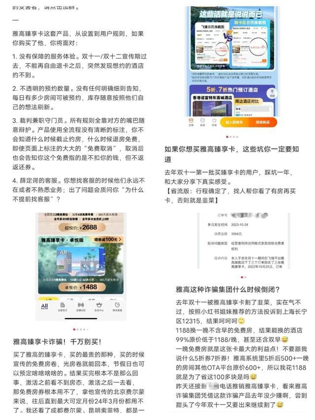 小雪(化名)去年双11在某第三方平台上花费1388元购买了雅高集团的臻享卡(卓悦版),除1晚免费住宿外,还可享受5折券、7折券、行政酒廊礼遇券等14项权益。然而,在今年的3月、6月和10月,每当小雪想要预约酒店,都找不到可以兑换免费住宿权益的房源。但从雅高集团自有渠道、OTA(线上旅游预订平台)等常规渠道看,心仪的酒店均可以正常预订,不存在满房情况。
