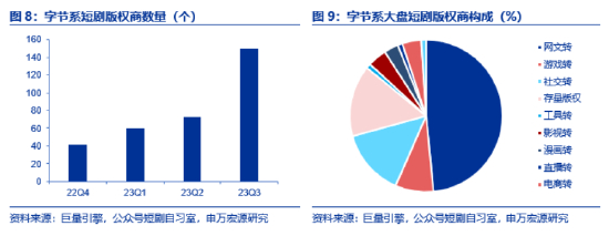 另一方面是供给快速扩增,短剧投资体量轻、回款周期短、制作门槛低,网文、社交、游戏、电商等公司纷纷转型入局;20年后疫情、监管等外部影响,长剧寒冬,传统影视制作公司也在转型。根据巨量引擎,从去年Q4到今年Q3,字节系版权商数量从41家上涨到150家。