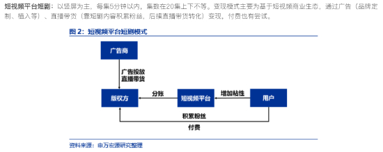短剧不是新概念,长短视频平台布局短剧已久,小程序短剧正兴起。目前主要分为三种类型:1)长视频平台短剧,以横屏为主每集5-10分钟,集数在20集上下不等。变现模式主要为平台版权采买、播放分账、广告植入。2) 短视频平台短剧,以坚屏为主,每集5分钟以内,集数在20集上下不等。变现模式主要为基于短视频商业生态,通过广告、直播带货变现,付费也有尝试。3)小程序短剧:以竖屏为主,通常单集时长1分钟左右,单部作品百集体量,通过平台投流带来精准流量,吸引用户跳转小程序平台付费观看。