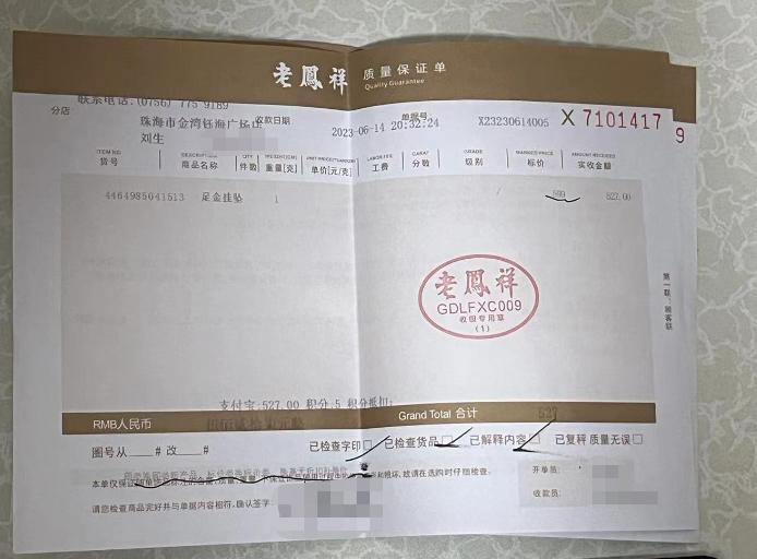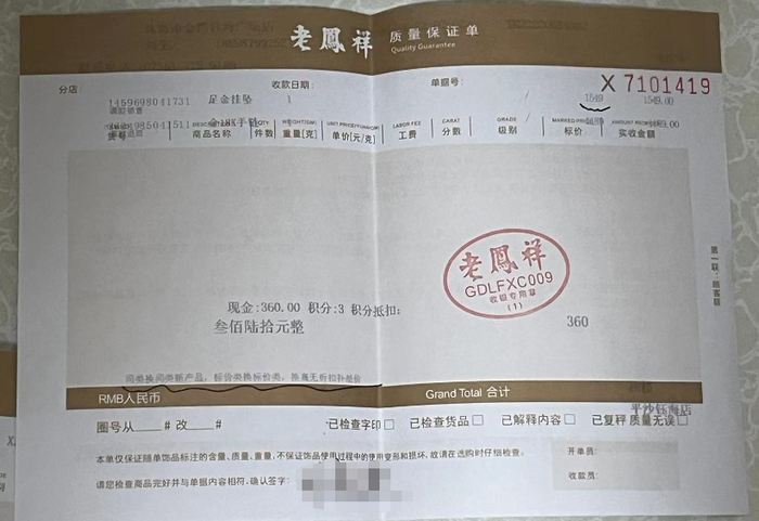 珠海的刘先生向《消费者报道》反映称,他于今年6月在老凤祥门店购买了一个折后价527元的黄金足金挂坠(下称挂坠A)和一条1189元的铂金手链。