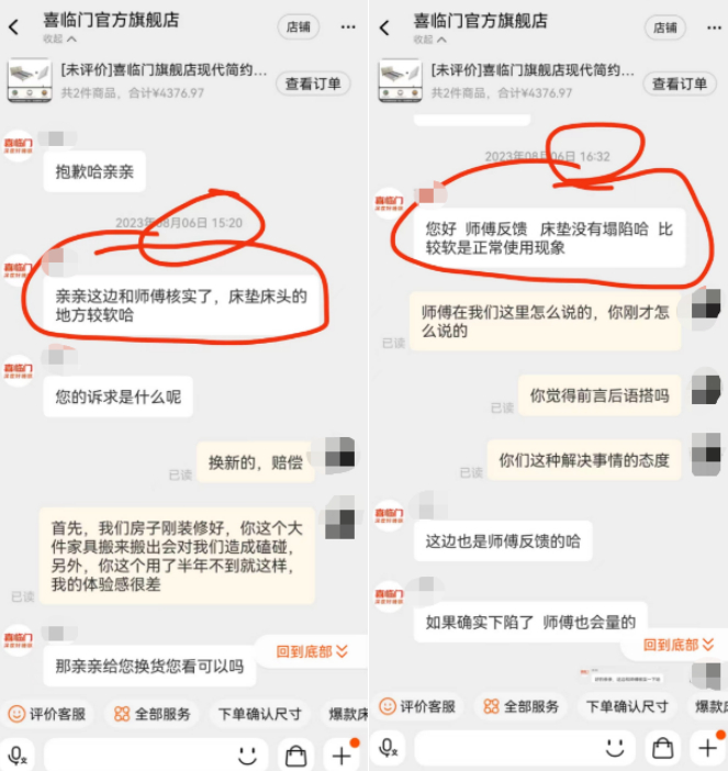 由于床垫使用未满一年,加上是内部填充的质量问题,杨女士向店铺客服提出“换新+补偿(200元与一对枕头)”的诉求。她向记者解释提出这个诉求的原因是她家完成装修不久,大件家具的搬进搬出容易对地板以及其他装修造成磨损。而且床垫填充物出问题,维修后可能还会出现类似的情况。