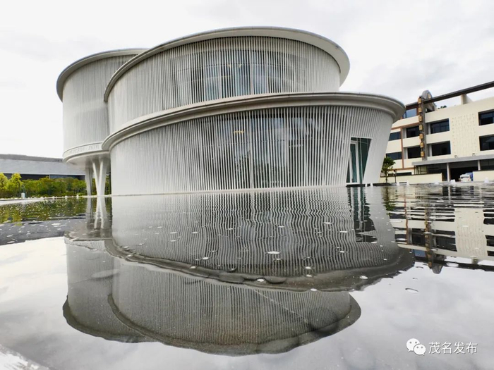 中国牙雕艺术馆整体色调采取的是南玉的绿色和象牙的白色,由三个大小不一的圆组成。从上方看,它就像是一个纽扣,将现代化的会展中心、新图书馆与传统意象的窦州里连接起来,成为传统与现代沟通的桥梁。
