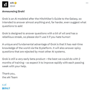 xAI同时表示,这个模型至今只花了2个月时间来训练,所以仍是非常初步的版本,现在每一周都在迭代进步。这个模型也具有非常独特的数据优势:通过社交媒体X平台的数据,该模型能够获得对这个世界的实时认知。同时该模型也会回答“可能会被大多数其他模型拒绝的辛辣问题”。